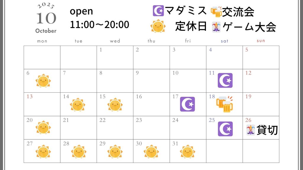 また、日曜日のみの営業に関しましてはイベントにより貸切になる可能性もございますのでカレンダーや日々のSNS投稿からご確認いただけますと助かります
